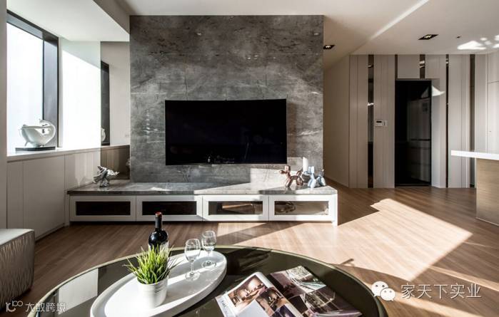电视主墙带入石材运用,藉由其质材特性与轻浅色泽,作为空间中的安定力量。