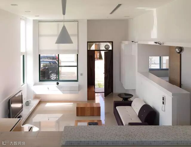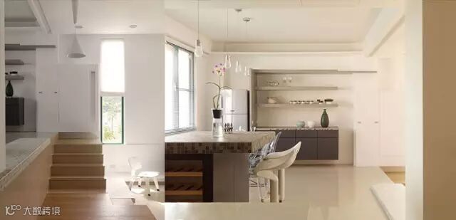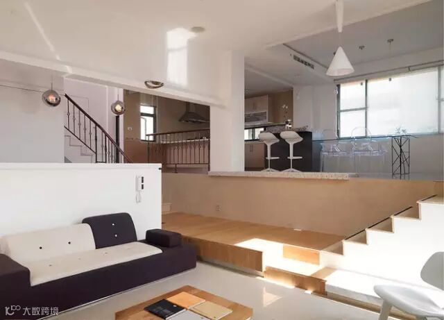 ▲这栋房子的分层独立规划的设计是条理清晰又赋有弹性的,我们现在看到的一楼区域分别是客厅,餐厅,厨房。虽然是开放型的设计,但是空间设计师以高低结构来划分了各个区域。客厅在最低的部分,餐厅部分架高,用小楼梯增加趣味性和美感。