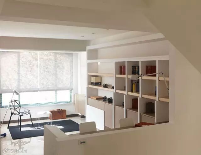 ▲走上二楼,会发现男主人的起居室和书房,想必在这样的环境阅读是件很惬意的事情吧。起居室与卧眠区採架高地板与推拉门片,呈现空间运用的最大值。值得一体的小细节亮点是窗边的几何状椅子,特别有设计感。