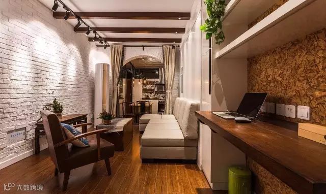 1、原来的厨房与卧室之间的墙拆了,打通的空间设计了玄关+洗手台+衣帽间+书房+客厅/卧室;
