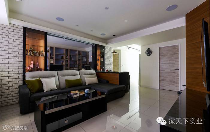 打破实体结构,沙发背墙以透视感玻璃与展示柜的手法划分领域,穿透感与灵活的设计。