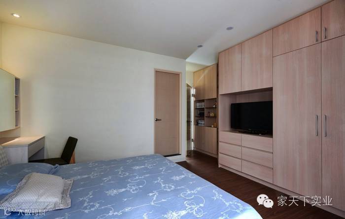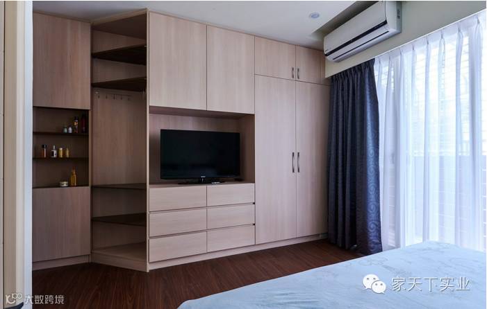 收纳柜在设计上,将电视空间与衣物的收纳方式都予以考虑,斜角的立面处规划出垂挂衣物的空间。
