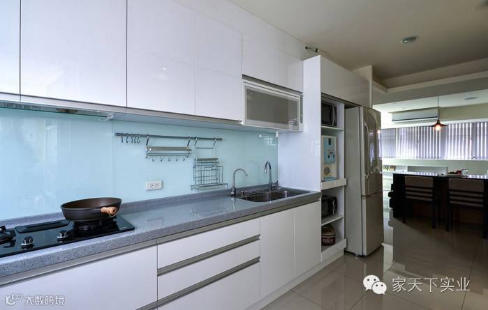 以白色系为橱柜的主要色系,蓝色调化作工作平台与置物的墙面,让烹调空间营造出清爽与干净感受。