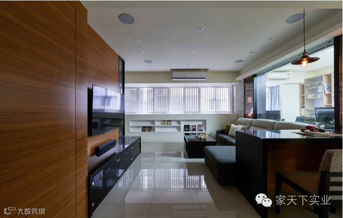 开放式的动线,让空间更显弹性,柚木材质铺陈电视墙与一旁的化妆室门扇,延伸出美感与气势。