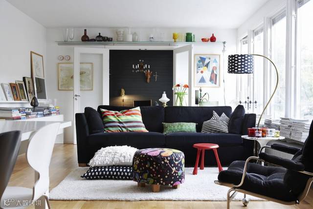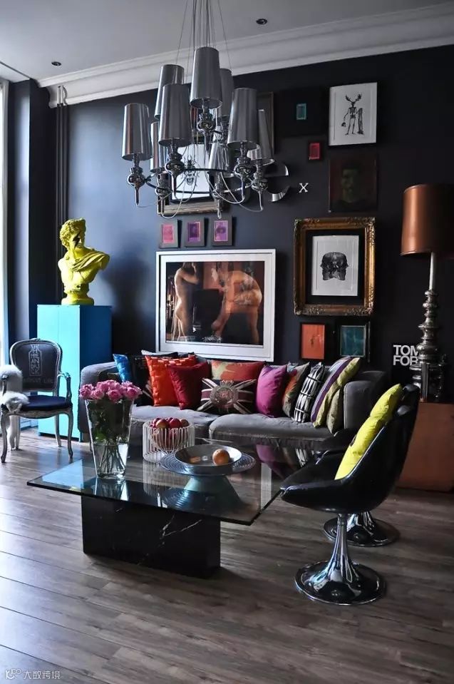 偶尔出挑的艳色为深色调的空间做点缀,形成的视觉体验也是非凡的。