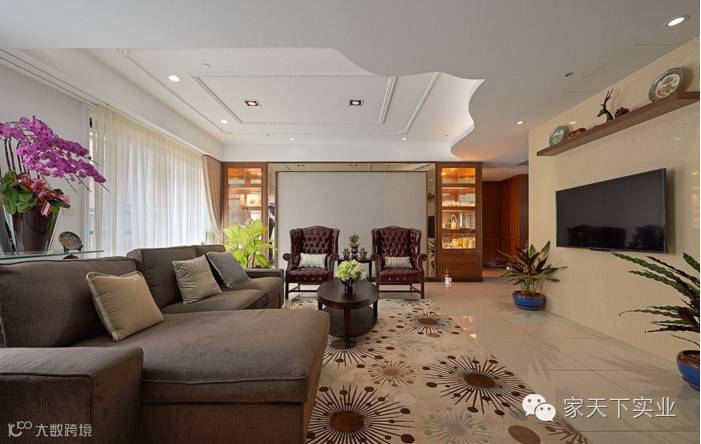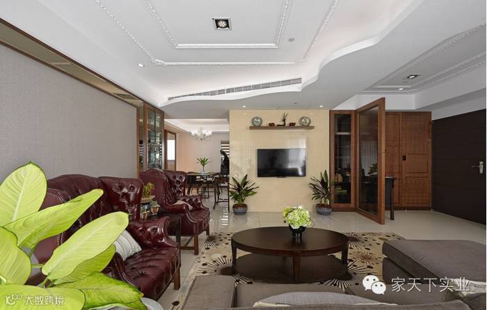 以开放式设计让公共活动空间保有屋主期盼的宽适感,藉由天花及屏风意象区隔空间关系。