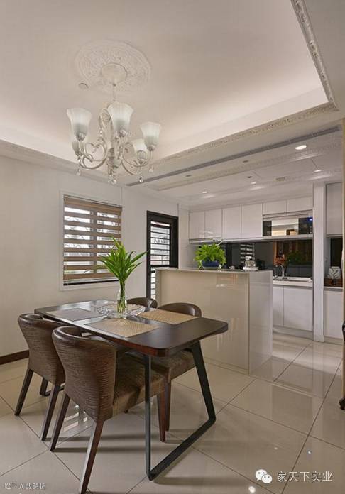 餐、厨区以中岛吧台做界定,塑造干净敞亮的空间段落。