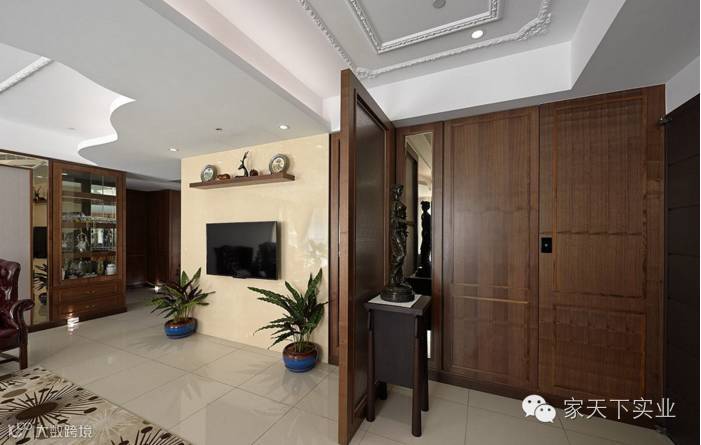 入门处以深色木质鞋柜为空间带来安定感,端景处结合屏风意象化解风水顾虑。