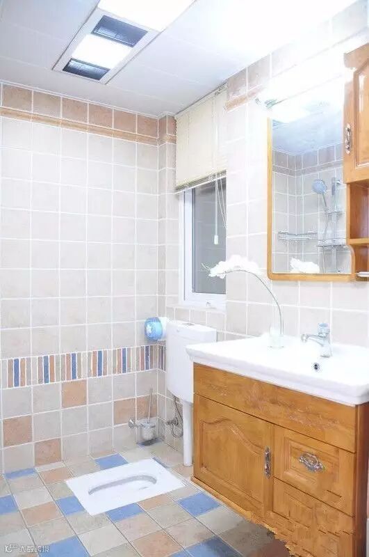 ▲ 卫生间虽然比较小,但是墙和地板都采用了彩色瓷砖,不会让空间变得烦闷。木质的储物柜让整个室内风格达成统一。