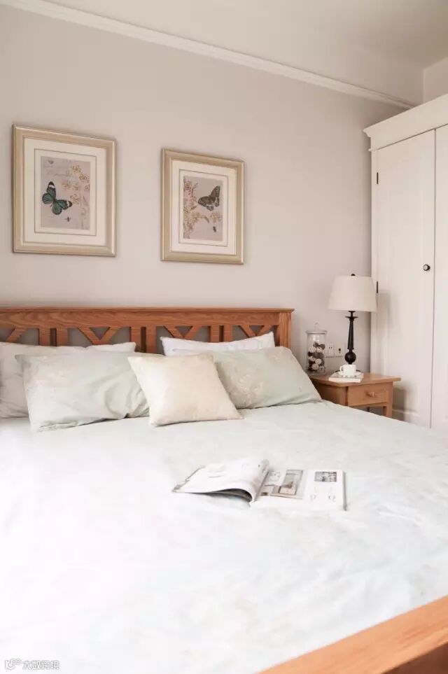 ▲ 主卧更突出一些美式的味道,浅色系的美式风格一样可以韵味十足。墙上的蝴蝶装饰画为卧室增添一丝浪漫的气息。