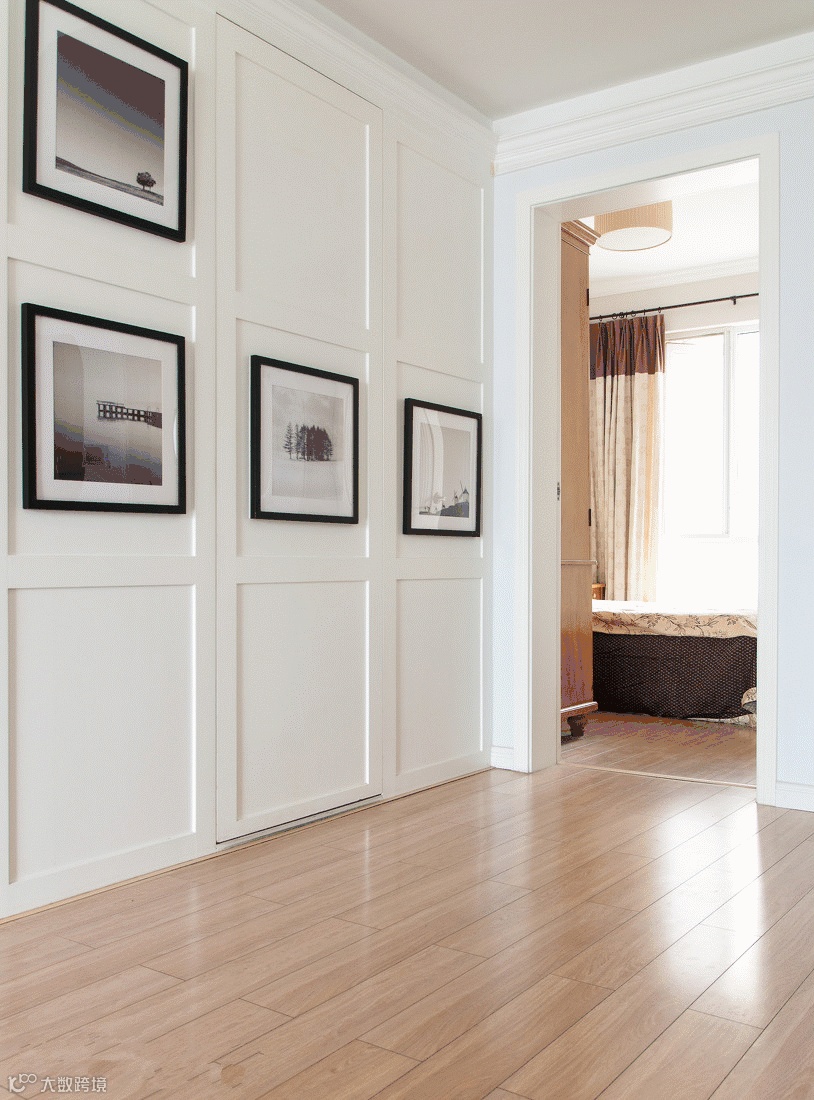 ▲ 有人可能会说,这面墙好漂亮啊!告诉大家,这其实是厨房的隐形门哦!造型墙面和木线装饰等都采用白色,中间的那扇可以打开,关上之后,就和墙面融为一体,成为一面艺术墙,完美的将厨房隐藏起来。