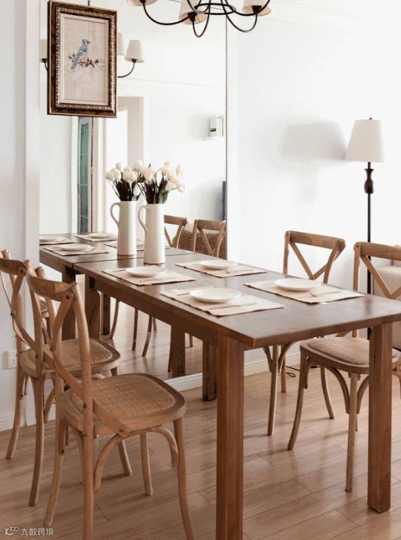 ▲ 餐厅与客厅相连,原木色系的餐桌椅,非常纯净清爽。在侧面墙上安装一面大镜子,让空间更显宽阔。