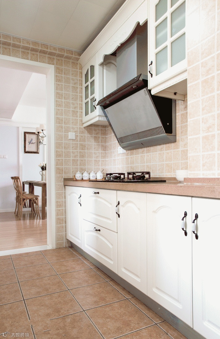 ▲ 隐藏门内别有洞天。厨房采用白色和浅咖的组合,让空间看起来特别清爽干净。美式的橱柜也与室内整体风格相统一。