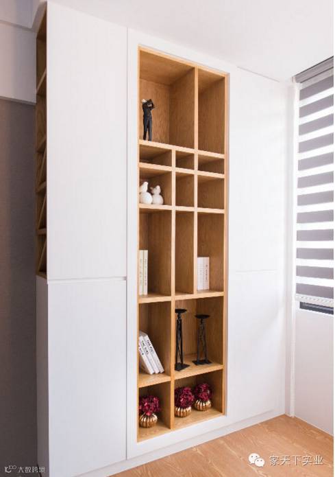 于电视主墙规划层板展示架,摆上展示小物及相片回忆,生活的痕迹就从此处开始堆积。