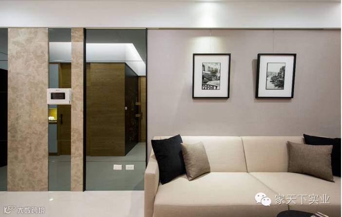 沙发左侧墙面,宽窄交错的大理石与镜面线条,是隐藏电箱的巧思安排,同时也放大空间视感、丰富立面表情。