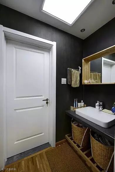 ▲ 卫生间选用灰色的瓷砖比较耐脏,洗手台底下放了两个藤条收纳筐