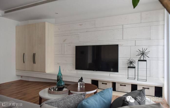 客厅的电视主墙以大理石切割拼贴而成,将冰冷印象的石材变化出活泼趣味的质材表情。
