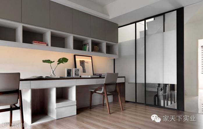 以铁件玻璃拉门作为书房的隔间,中段特别采用不透光的质材兼顾隐私性。
