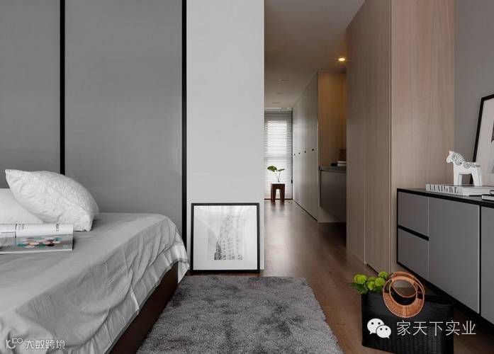 将床头背墙予以留白,仅透过家具与软装的选搭,简单营造现代美感,让主卧空间回归纯净舒适的本质。