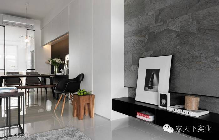 设计师以天然薄板岩作为电视主墙,藉由其独特的纹路肌理衬托居家空间的内敛品味。