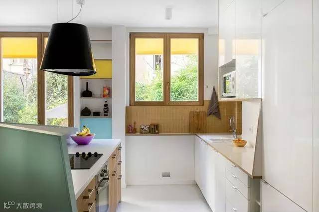 这个转角厨房明亮洁净,虽然很小,但是功能很全,也做了足够的收纳空间。