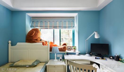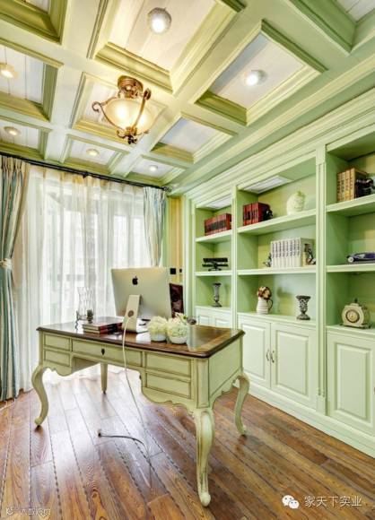 蓝白搭配的田园风梦幻工作区,墙面选以纯粹天蓝色,完美利用小空间,功能配备齐全,设计紧凑而不显臃肿。