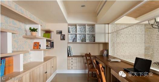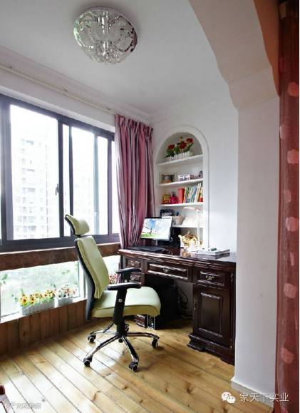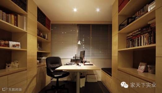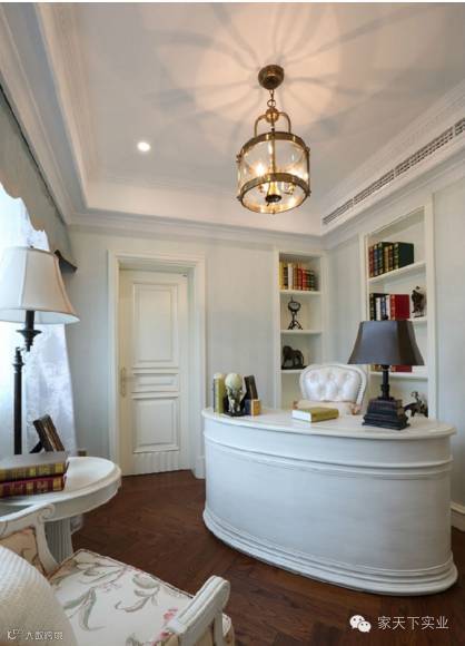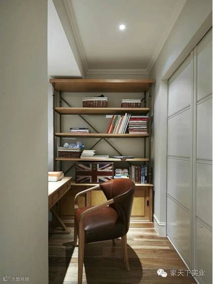 小户型复式办公区,坐落于二楼视线转角处,通过架高的地面介分功能区域,营造美式十足的居家感受。