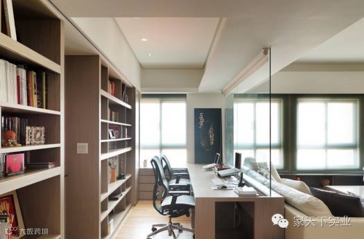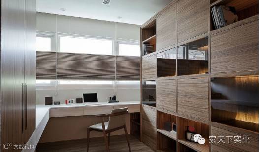 办公区规划于沙发背景处,以大片玻璃作为功能隔断,搭佐活动式卷帘,宽敞视野或私密办公,即可随心而择。