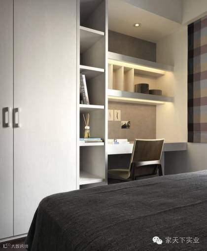 暗黑系床体组件,配合整体空间色调,构筑极简风,并于衣柜侧划分比例得宜的工作区,温馨别致。