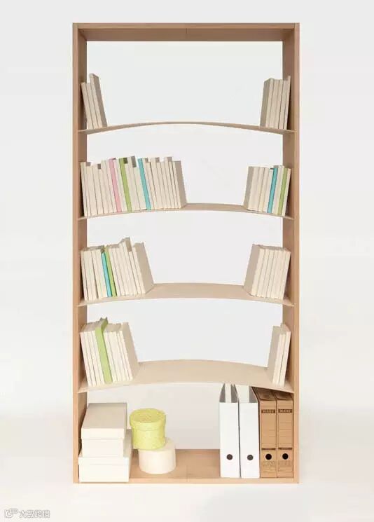 Bookshelf利用它本身的弧度,使得书本在放上书架后,自然的靠向一边,防止书本倒落。折叠的设计,方便了运输和组装。利用拱板自身产生的力量,使用者不需要打孔和螺丝就能轻易的组装起书架。