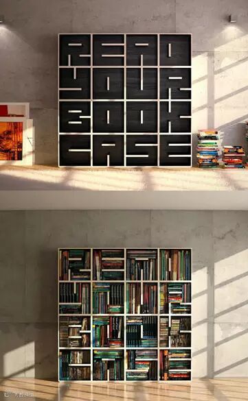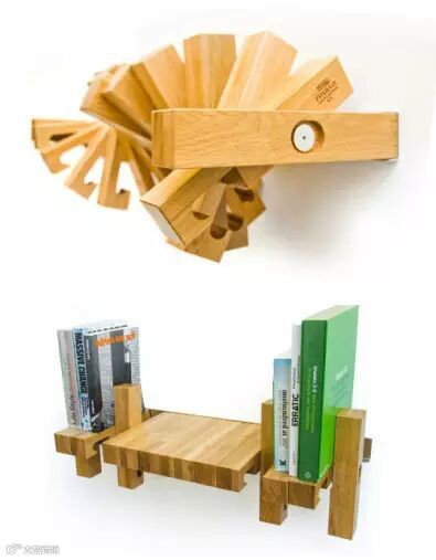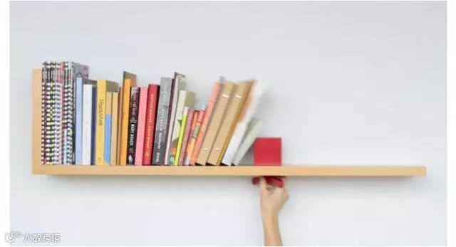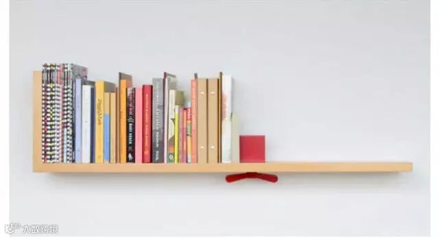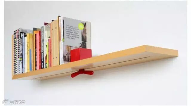 不占用地面面积的同时,装饰了白墙。此款设计多了一个可自由移动的小红块,可避免书籍倒伏。