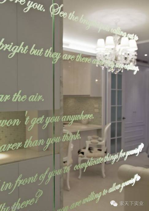 依循着喷砂字体,镜面谱下的人文诗性在灯光下低调显现,薄形门片的存在,用折射明亮收住了后方电錶箱凌乱,开展起空间尺度。