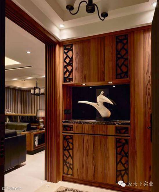 由木质元素包覆的端景台与柜面,给人亲切且温润悠闲的入门意象。
