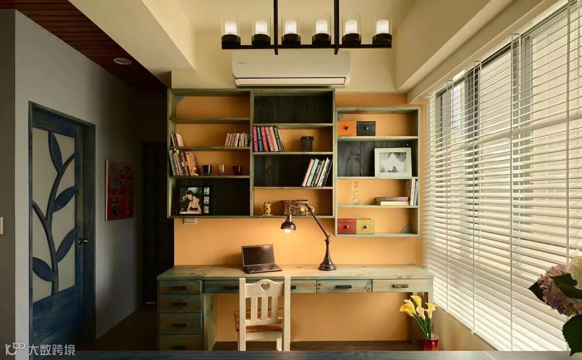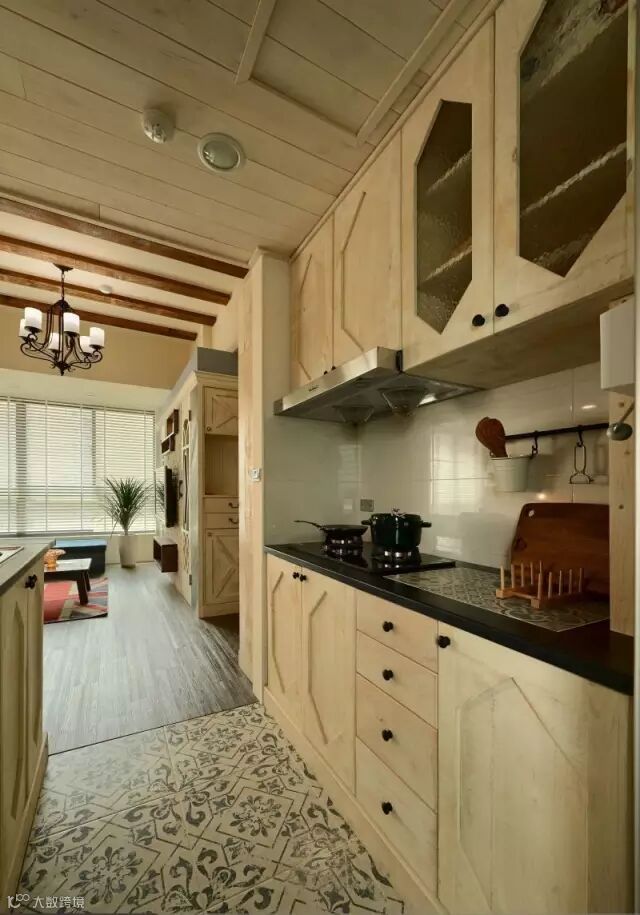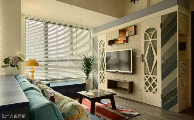 快节奏、繁华的城市当中,总希望有安静的栖息之地,感受到安逸舒适自由的生活,深色地板结合彩色家居搭配结合,空间区域对比划分明确,使空间充满世外桃源之感,水蓝色的美式沙发拉高客厅清爽度,搭配国旗图样的地毡与碎花抱枕,增添度假风格