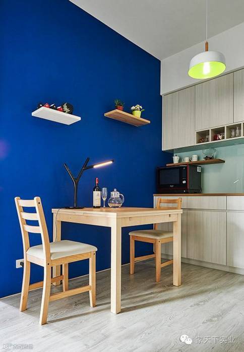 在风格设计方面,女主人喜欢简单、利落且有个性的居家空间,因此设计师以现代风的极简线条,搭配北欧风的活泼色彩,混搭出丰富的空间表情,大胆选用鲜明饱满的深蓝色作为餐厅的主色调,成功吸引目光焦点,佐以展示架上的装饰品做点缀,成为一处富有趣味性的段落风景。