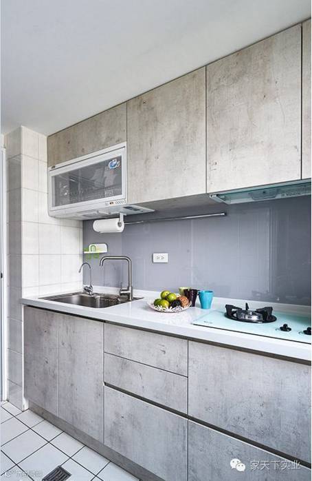 考虑到屋主的预算有限,保留厨房的地砖、壁砖与厨具,透过系统板材的运用,重新赋予旧厨具新风貌。