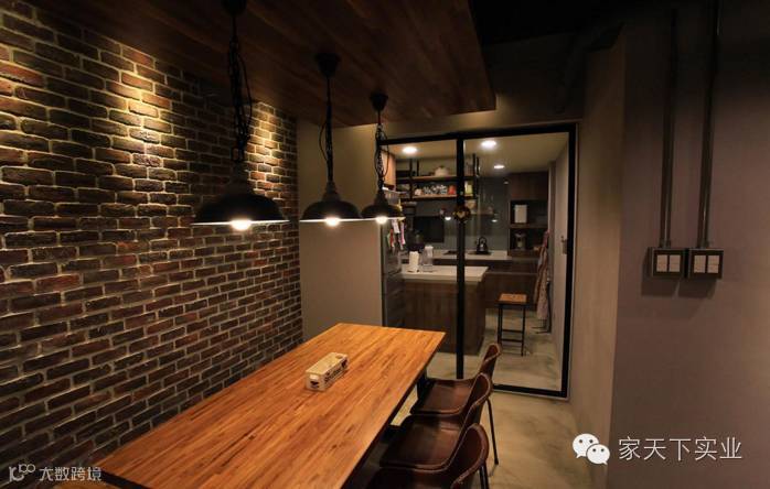 红砖色文化石墙面搭配工业风灯具与木质餐桌椅,呈现经典的美式工业风表情。