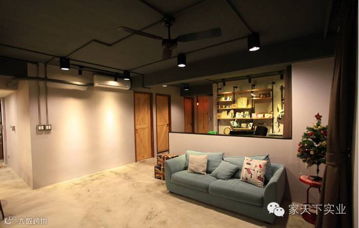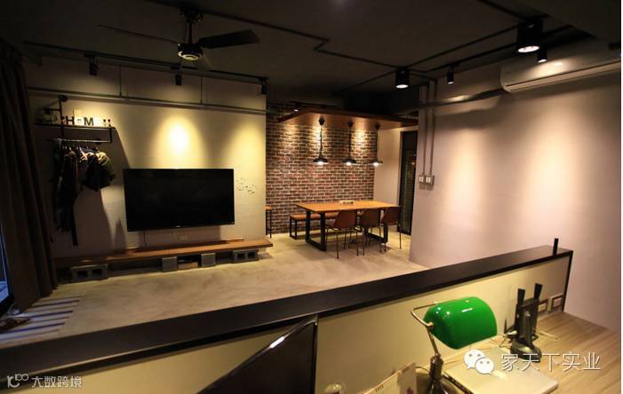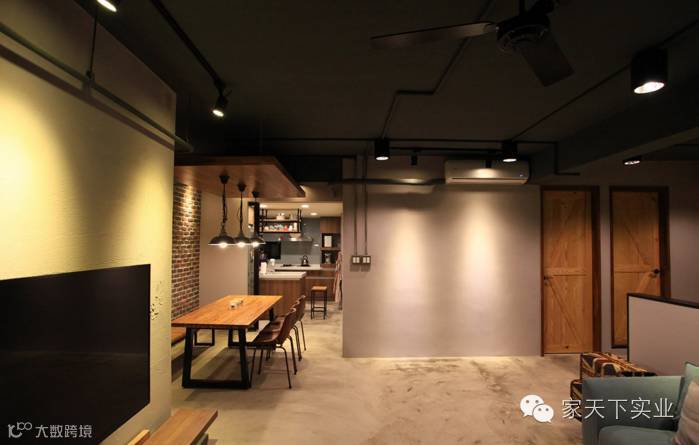 粗刮水泥电视墙、水泥粉光地板与裸露管线的深灰色天花,以粗犷本色构筑风格基底。