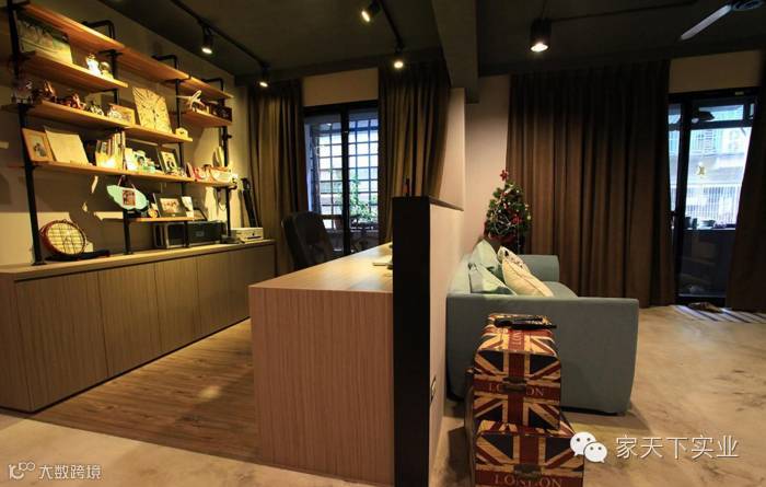 采不锈钢喷饰的造型水管搭配木作层板,增添简练风格的趣味性,也创造客厅丰富的视觉端景。