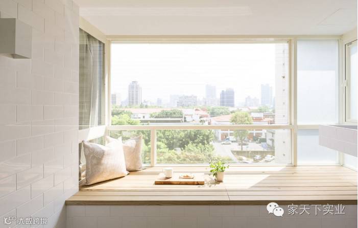 依照屋主需求,设计师将洗衣房安排在大面景观窗前,并加设木作卧榻平台,构筑一方日光赏景角落。