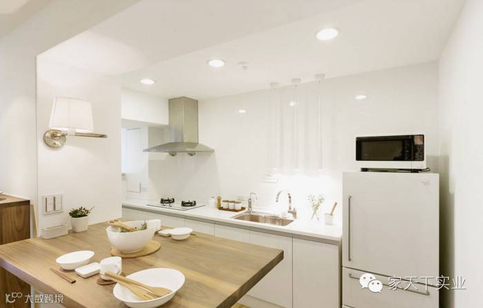 利用柜体深度规划的餐桌为活动式设计,而开放式厨房也采白色调与造型光影投射,融入整体设计语汇中。