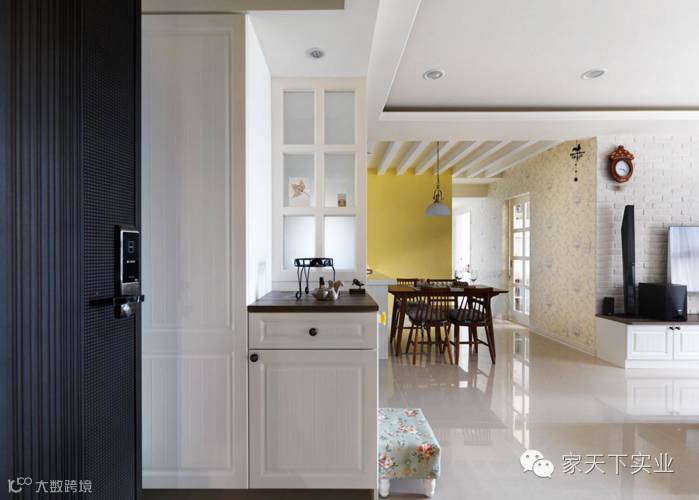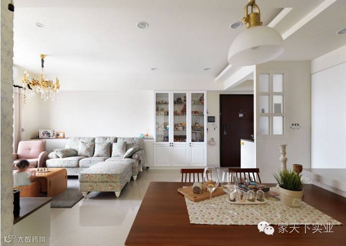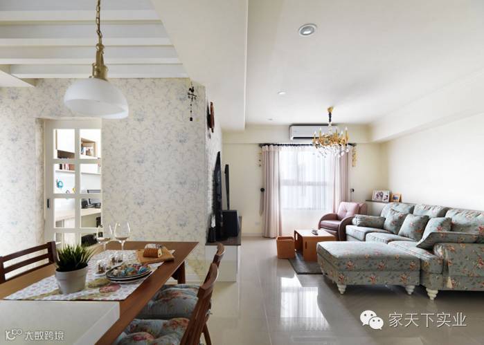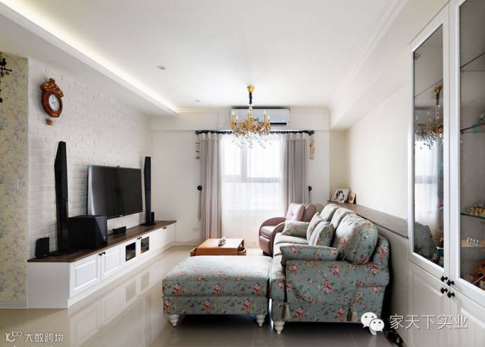 此案设计以乡村风为主题,并加入碎花元素与鲜明色彩,营造出有如日杂般的甜美氛围,客厅整体为白色基底,陈列充满庄园气息的碎花沙发,点出乡村风的清新主轴,且在电视墙以文化石铺饰轻柔气氛,搭配视听柜强调收纳功能。
