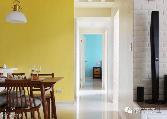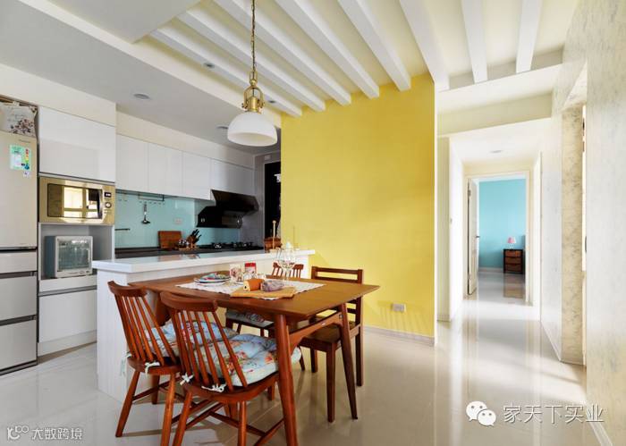 餐厅的鲜黄墙面,对应卧室主墙的天蓝色彩,在白色基底中别有一种缤纷情调。