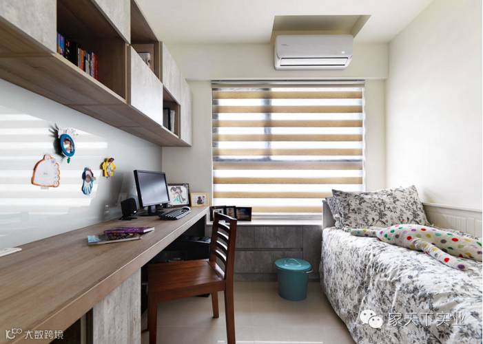 自然光洒落木质家具,温润书房的舒适美感,右侧的寝具配置,则是作为客房的弹性使用。