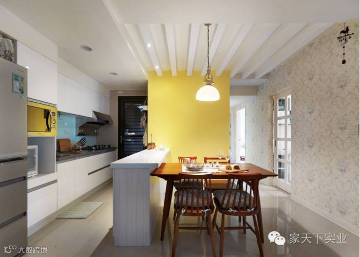 一抹鲜艳的黄,让视线进入餐厨区,开放式的吧台配置,则让空间保有通透视感并兼具功能性。