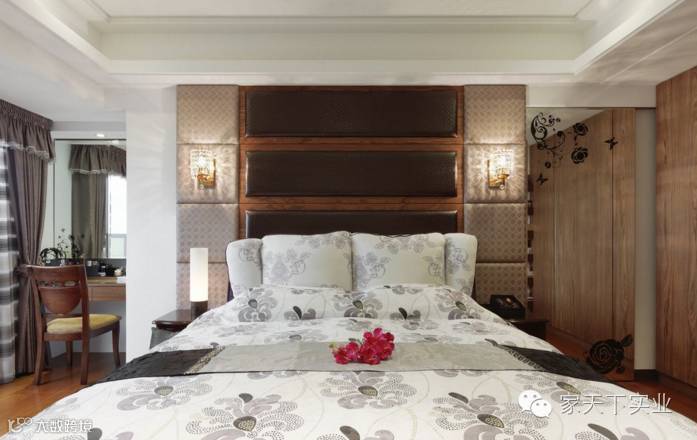 考量公共空间及另外两间孩卧都是浅色系,女主人便设法求变创新,使用重色结合华丽装饰,同时尊重先生偏好的原始风格,柜子均以木纹为主,满足二人的理想。