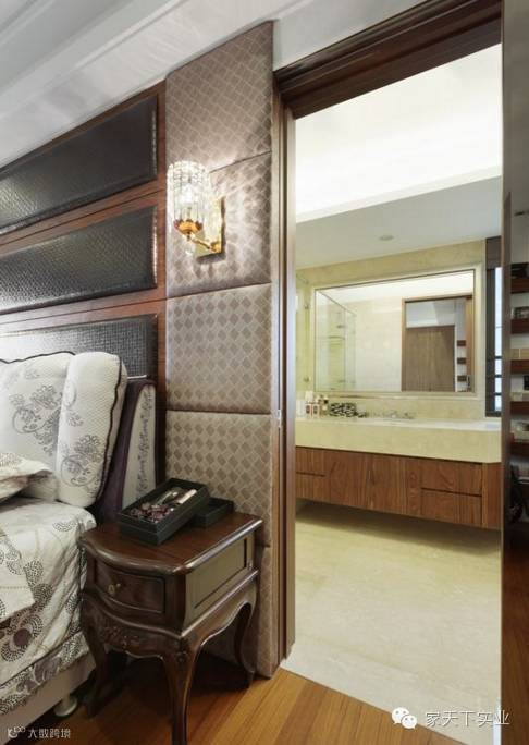 床头明镜是卫浴入口,相同的木纹延续到浴柜,串连一致的原始质感。