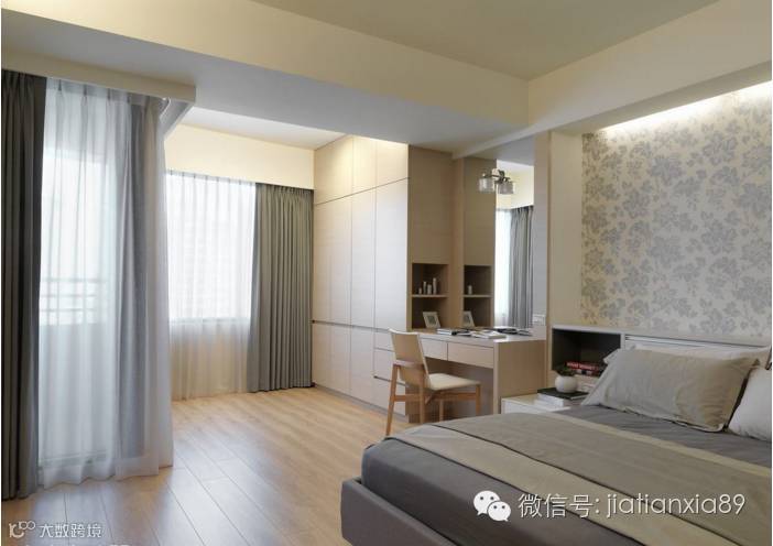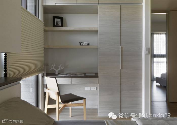 拥有开放式更衣间的女孩房,设计师以书桌为墙划分出睡眠区块,而美背设计在床尾也兼具出电视主墙功能。