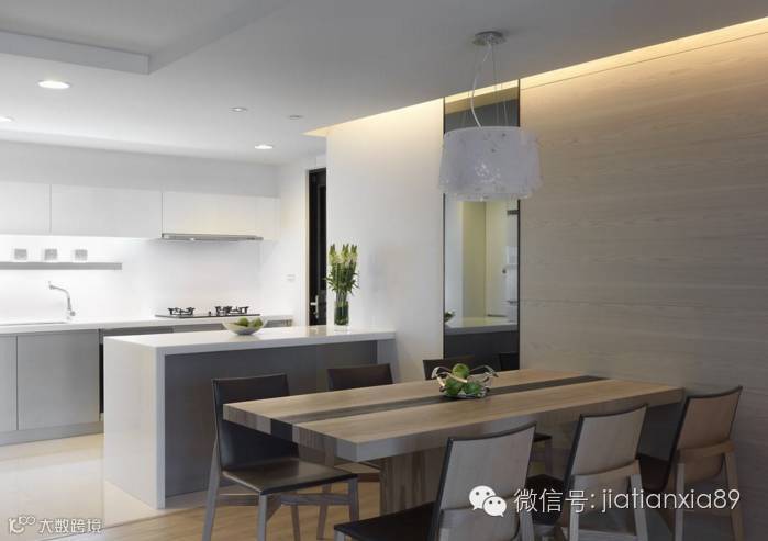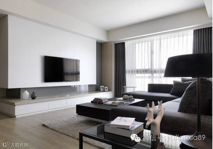 木皮色的电视主墙,局部跳以灰镜低反射度,让立面有了趣味变化。