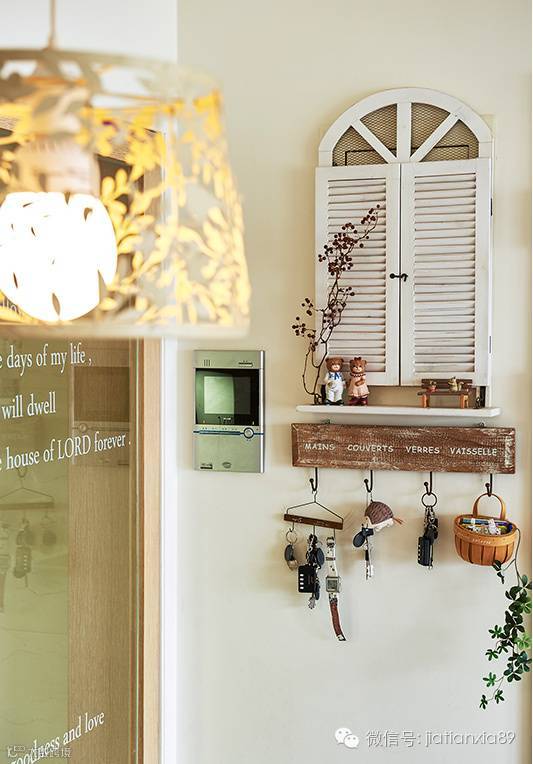 墙面以白色门扇与挂钩架创造精致的乡村色彩,成为迎宾处最迷人的端景与风格引领。